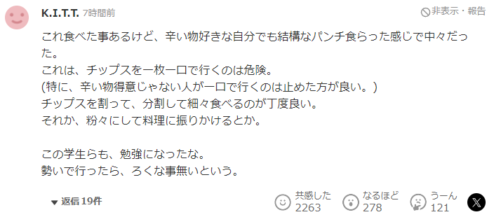 私は、度を越した辛い食べ物は苦手なので口にする機会は今後も訪れないと思っていますが、