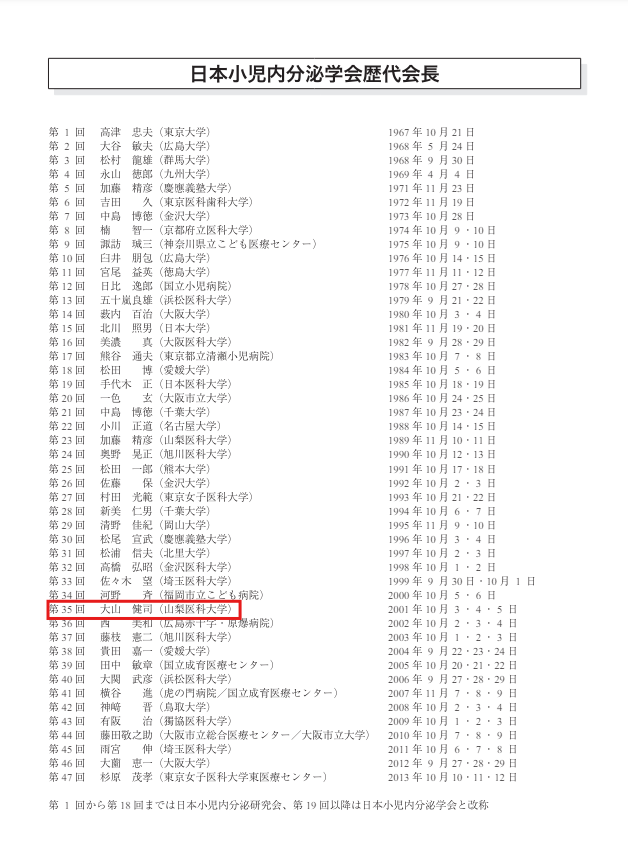 なんと大山健司医師は、「一般社団法人 日本内分泌学会」の歴代会長に大山健司医師の名前がありました!