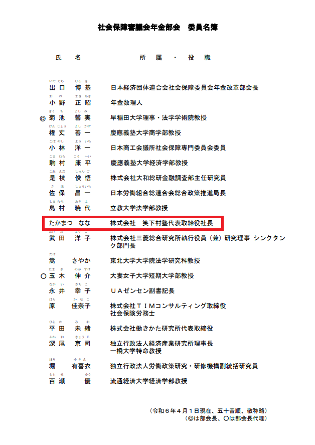 | 2024年 | 公職 | 年金部会の委員名簿に記載(PDF)。 (厚生労働省) |