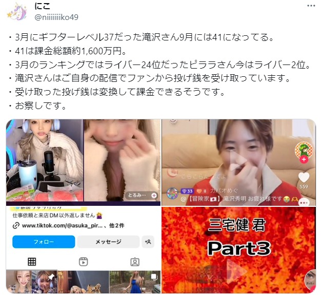 「TikTokは投げ銭の課金額によって『ギフターレベル』が決まるのですが、滝沢氏はLv41。これは、課金額にすると、約1600万円にものぼります。配信には誰がどのくらい投げ銭しているかがランキングで表示されるのですが、滝沢氏はこの女性の配信内で1位。この甲斐あってか、女性は3月に配信ランキング24位だったのが、現在は2位にまで急上昇しています」