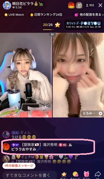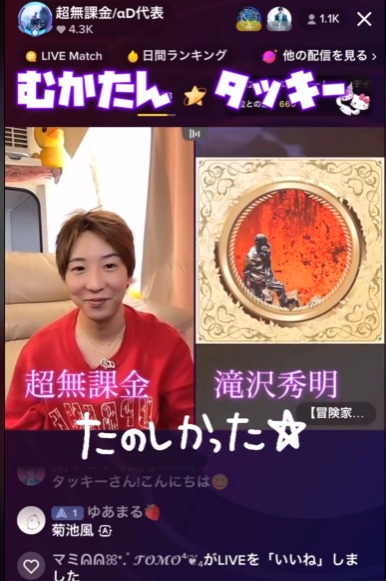 上の画像では、滝沢秀明さんが投げ銭(ギフト)を送っている事も確認できます。